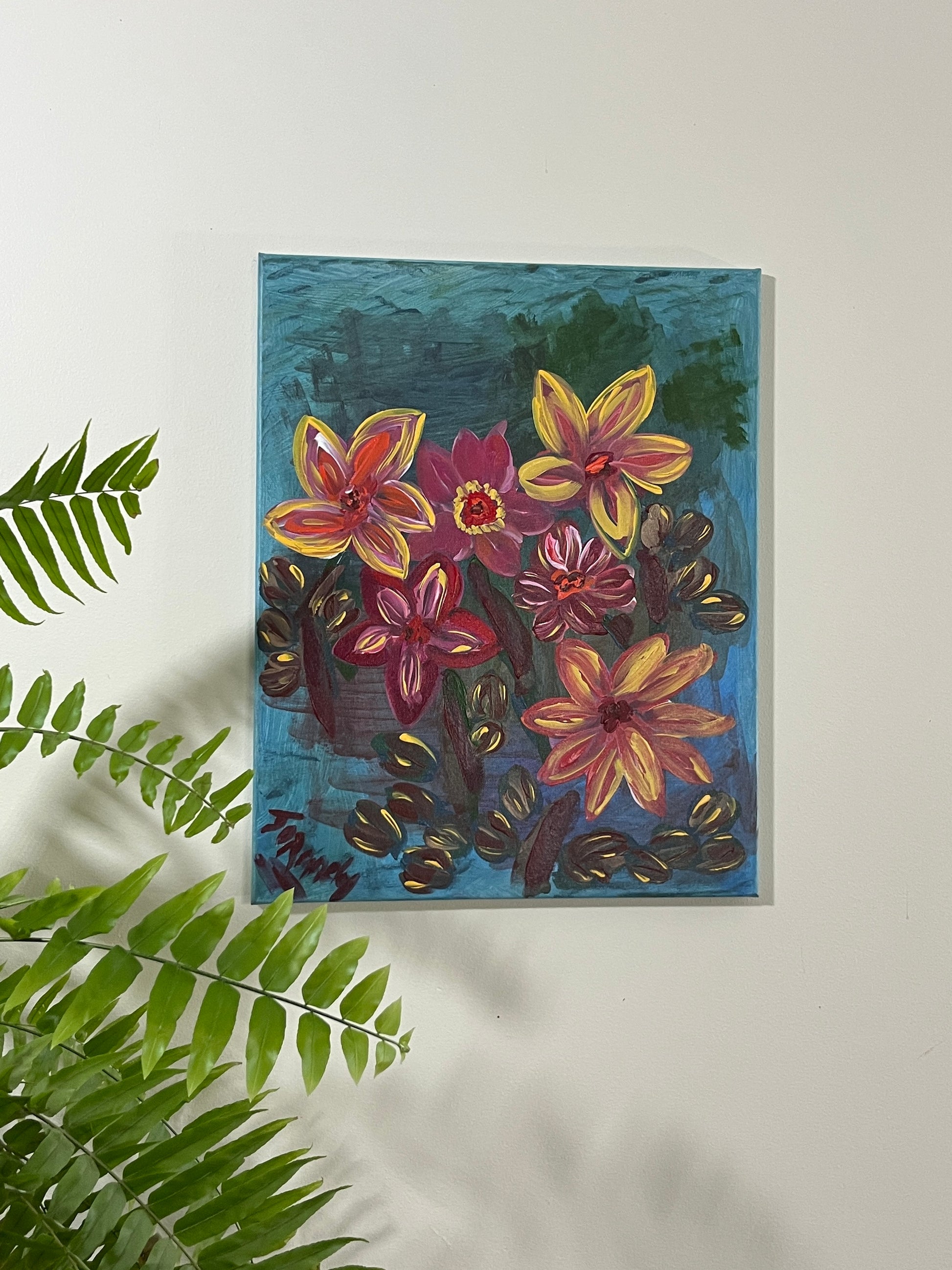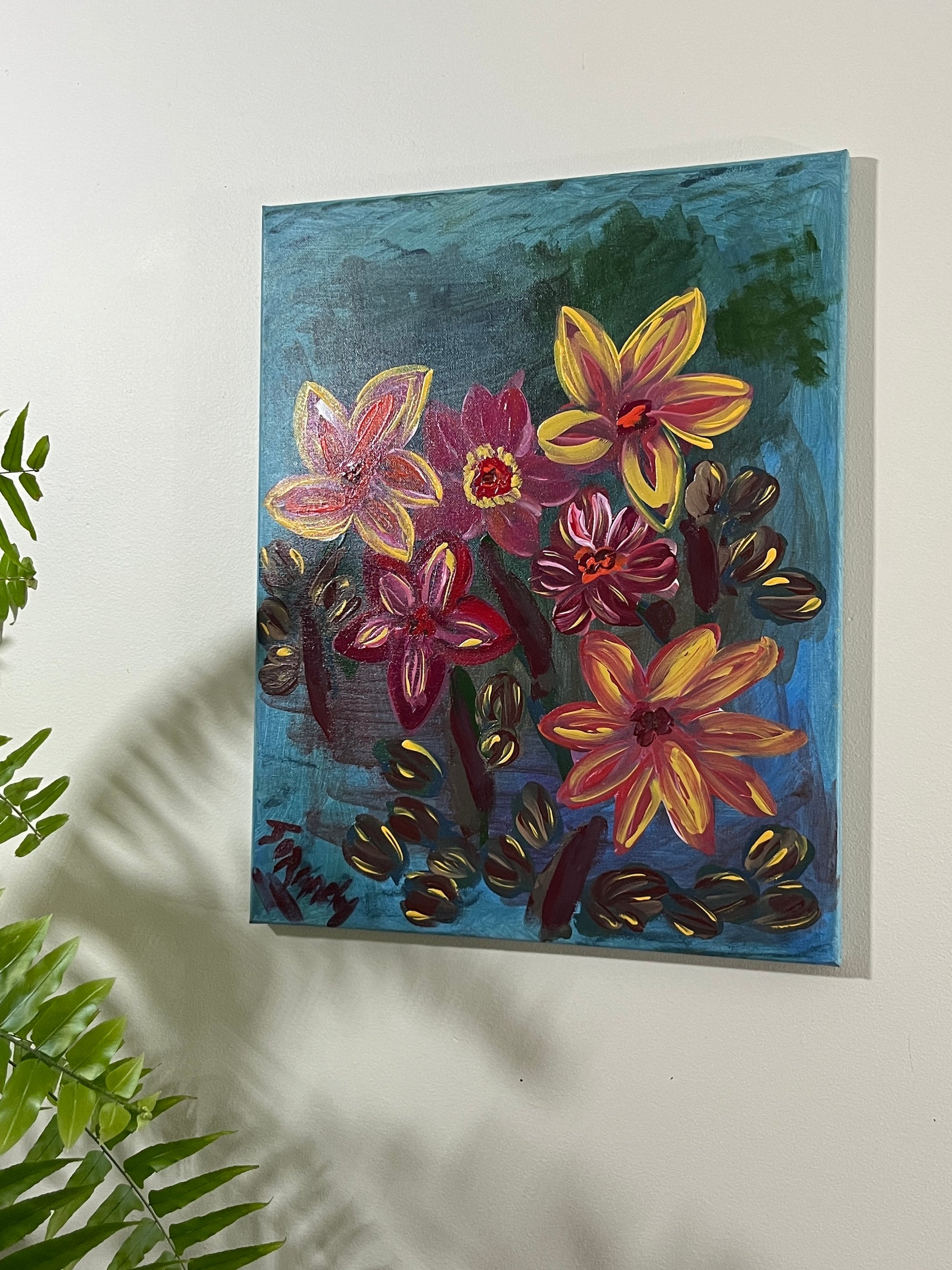 A vibrant floral display full of playful, childlike elegance, 'Clear Future' is a work that radiates abundant joy and peace. Painted on New Year's Day 2025, the piece uses pops of brilliant warm tones against cool blues to communicate a powerful and tangible clarity of hope.