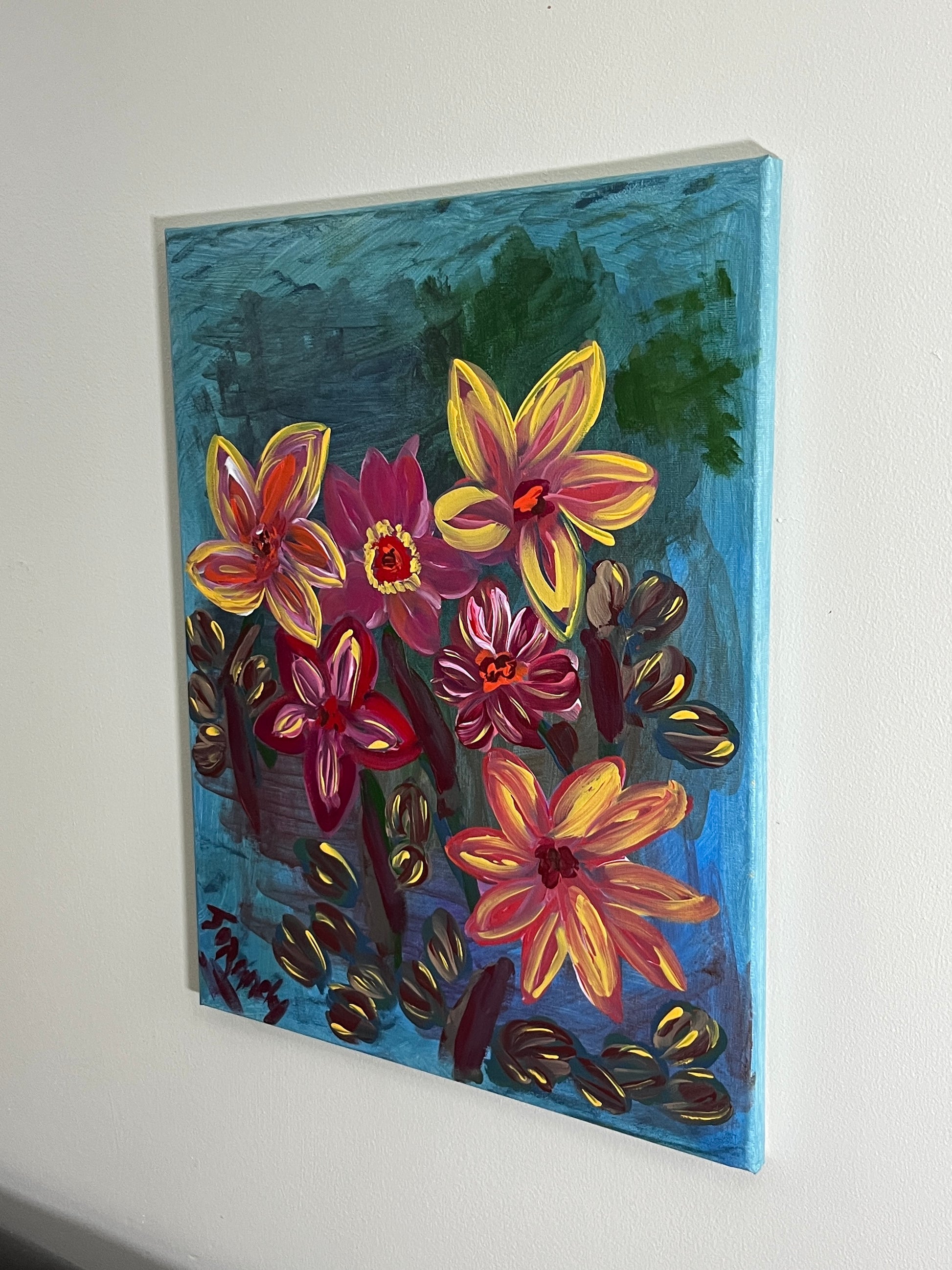 This painting is the first in the artist's Narrative Flowers series of 2025, a collection that explores a depth of spirituality and healing. The work is a direct expression of resilience and recovery from burnout, channeling a powerful feminine energy of tenderness and empathy. The bright, hopeful pops of colour are not just a stylistic choice; they are a therapeutic act, a deliberate cultivation of joy and a confident look toward the years ahead. It is a deeply personal and uplifting work for a collector who values art that tells a story of renewal and the quiet power of a hopeful heart.