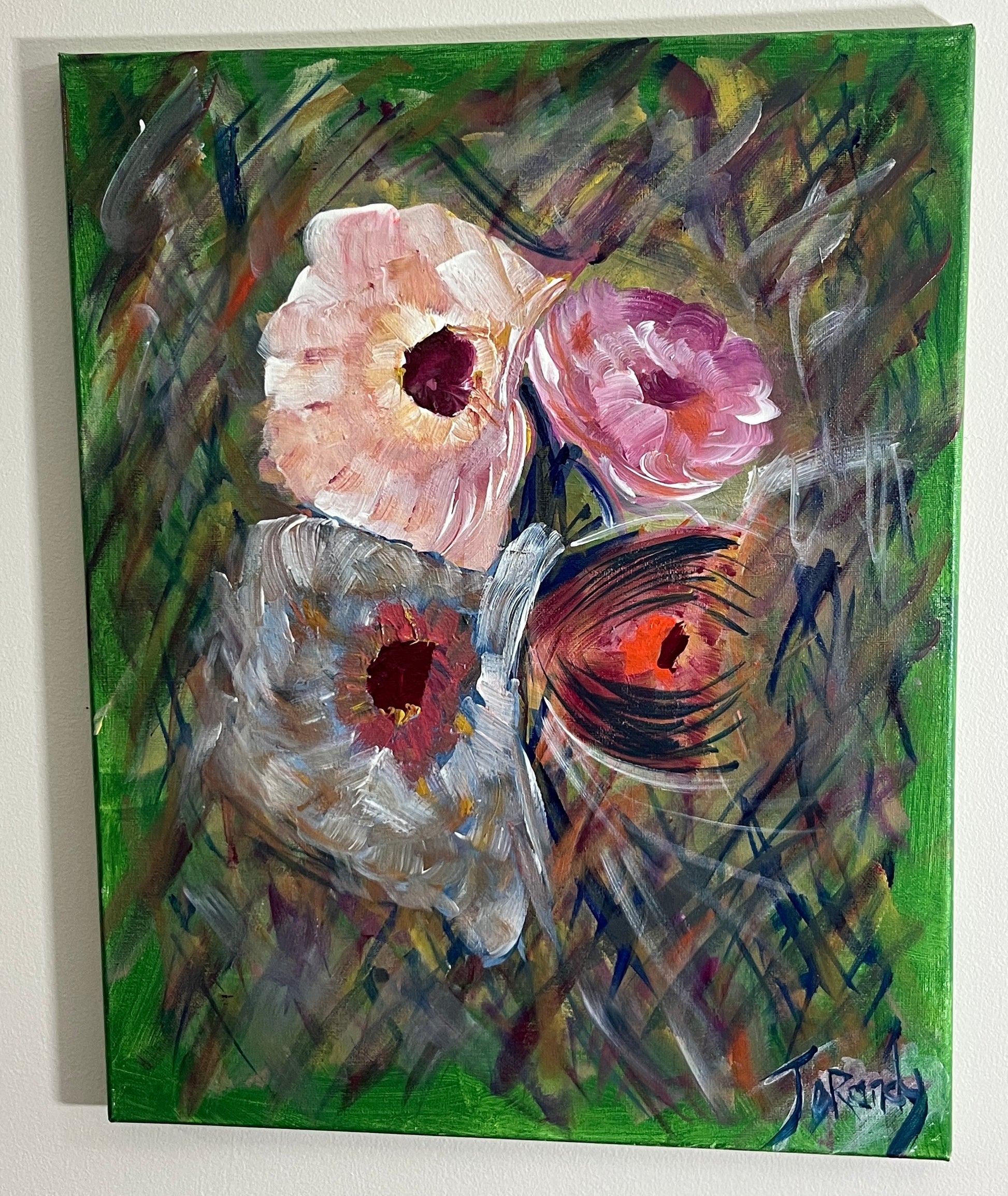 A bold and inspirational work, 'Don't Conform' is a celebration of individuality and the calm acceptance of being wholly oneself. The painting portrays four radiant flowers—at once blossoms, orbs of energy, and constellations of light—set against a dynamic, textured backdrop.