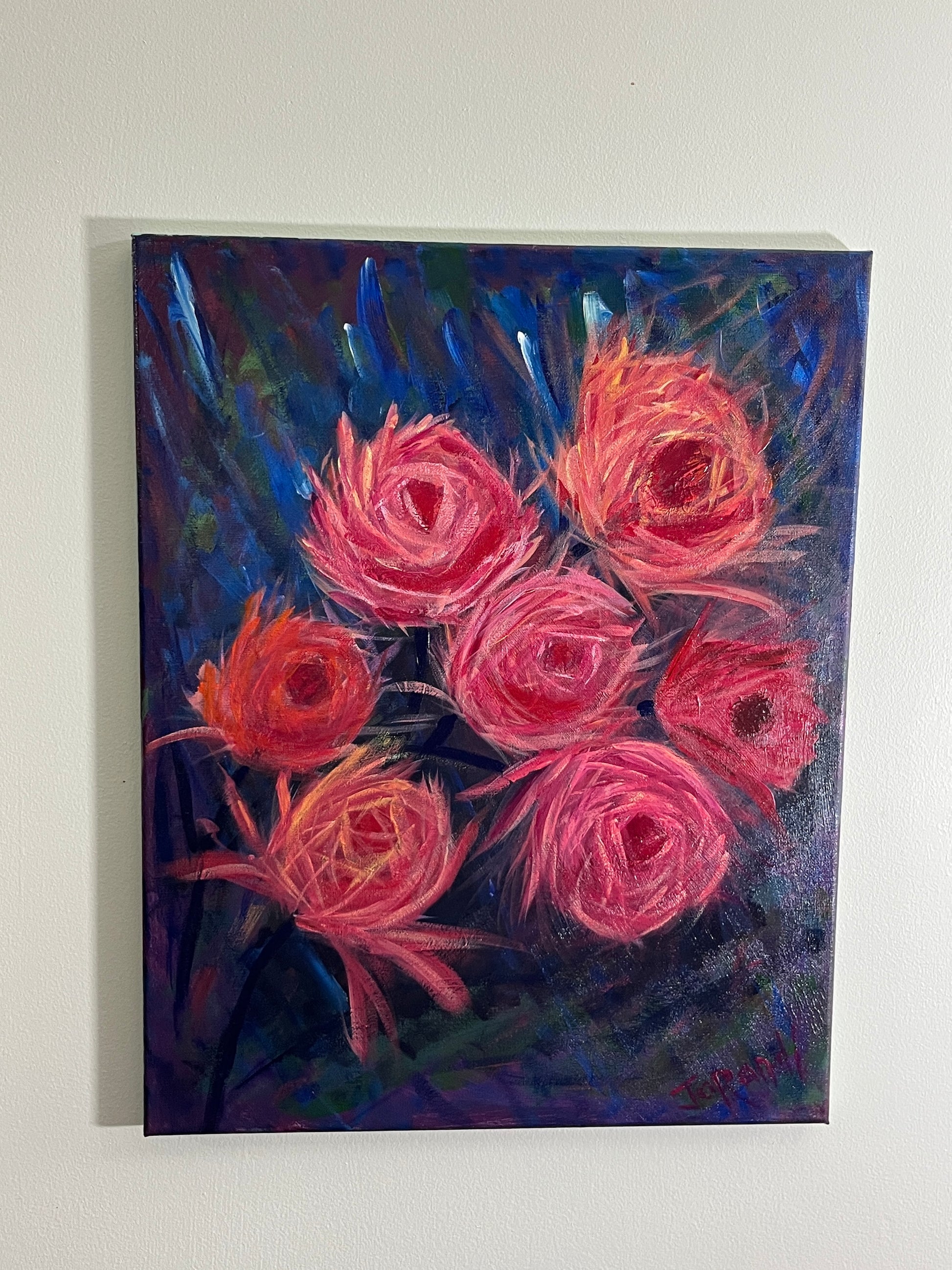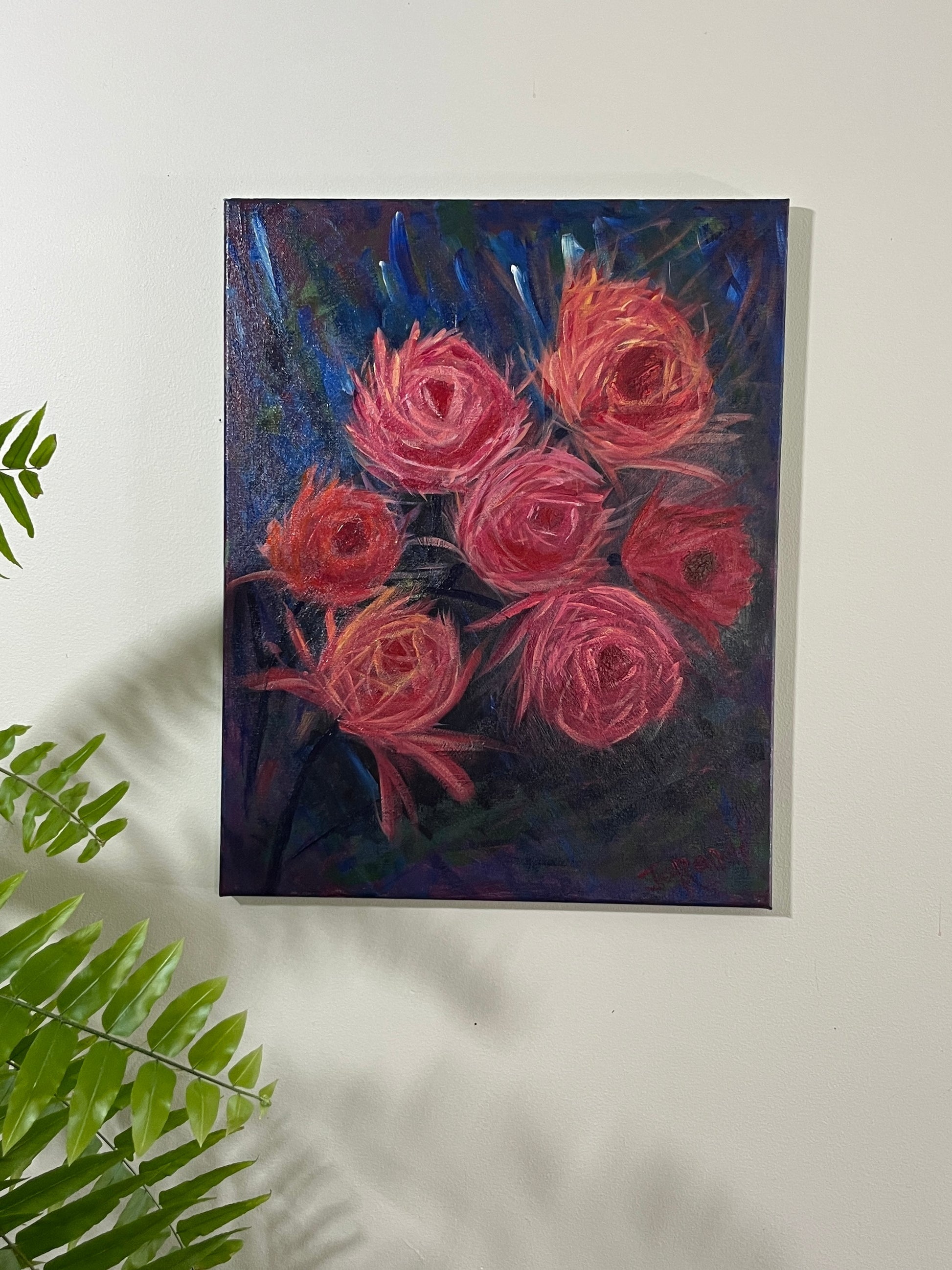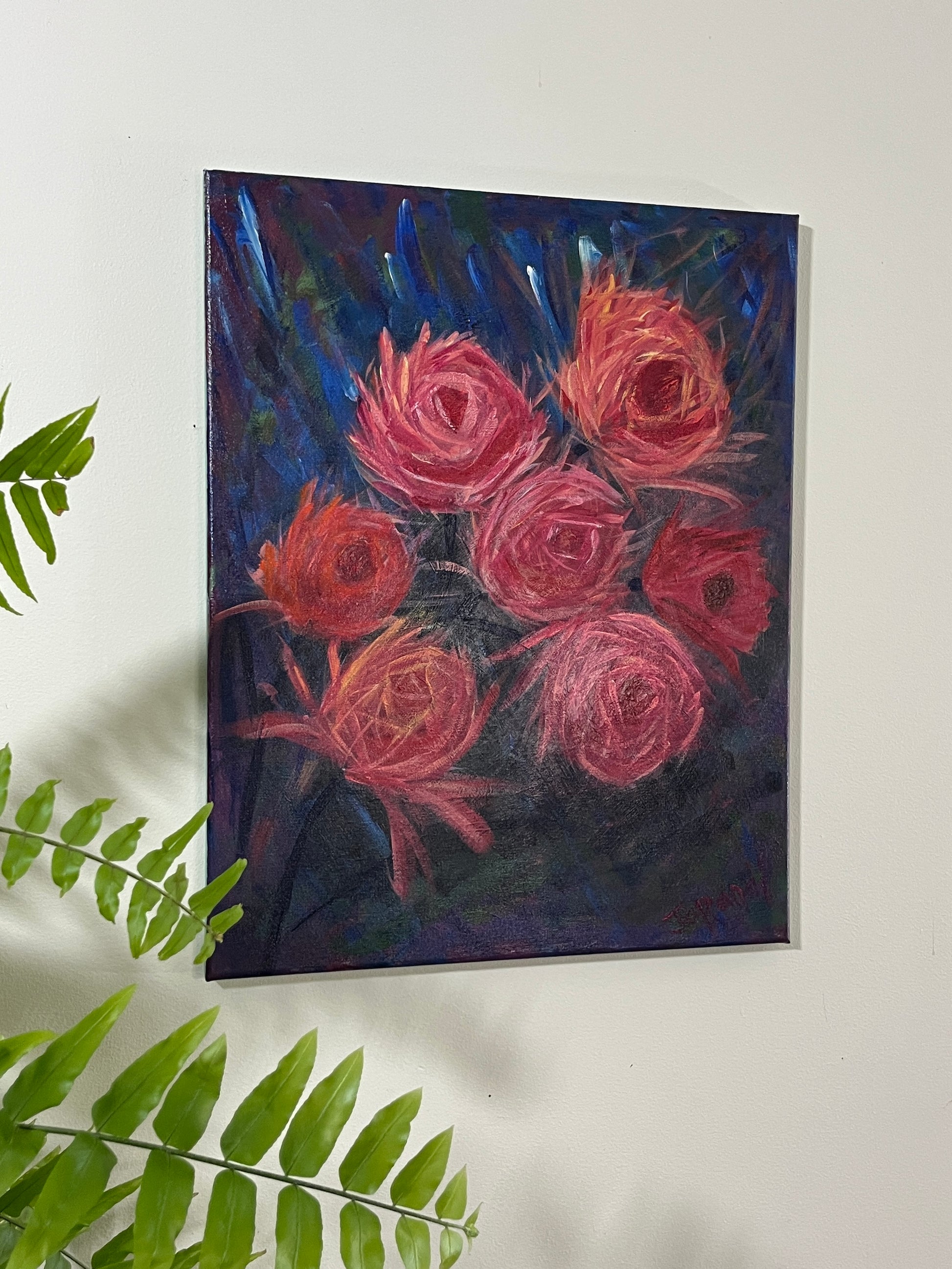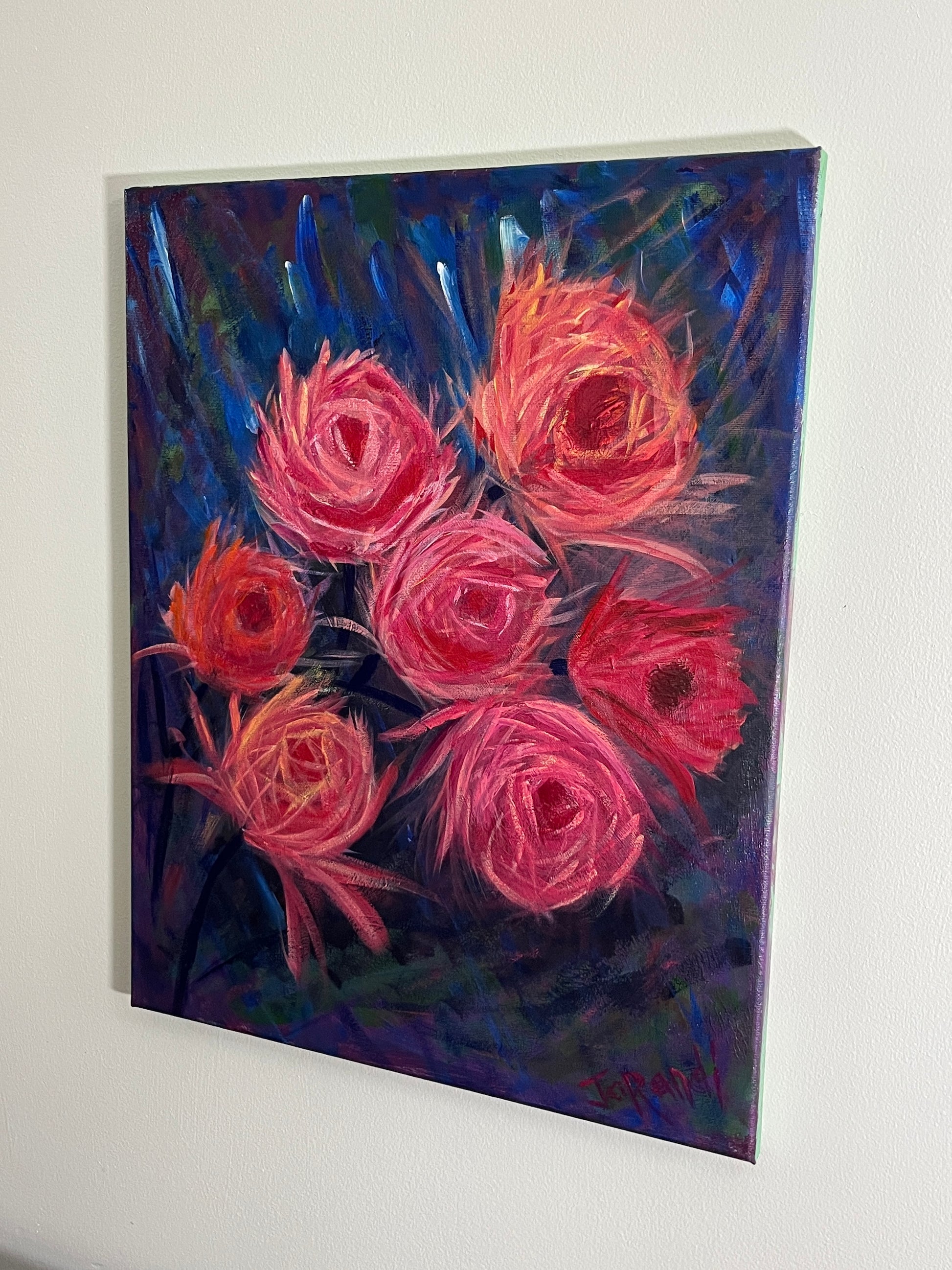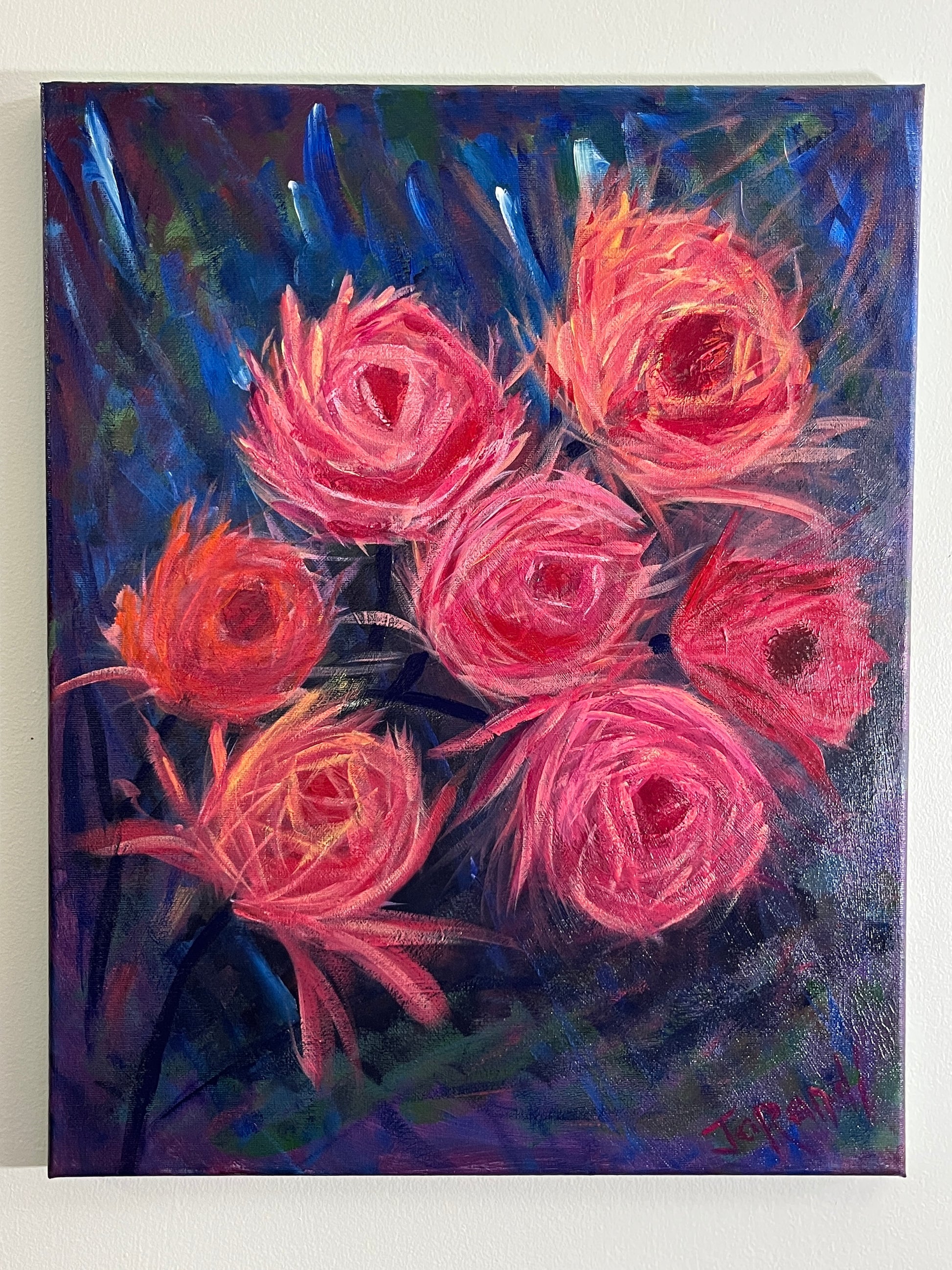Titled 'New Year's Day,' this vibrant work is a powerful expression of hope and optimism for the future. A set of seven full blossoms, rendered in brilliant pinks and reds, arises from a contrasting background of deep blues and crimson, radiating a sense of warmth, family, and abundance.