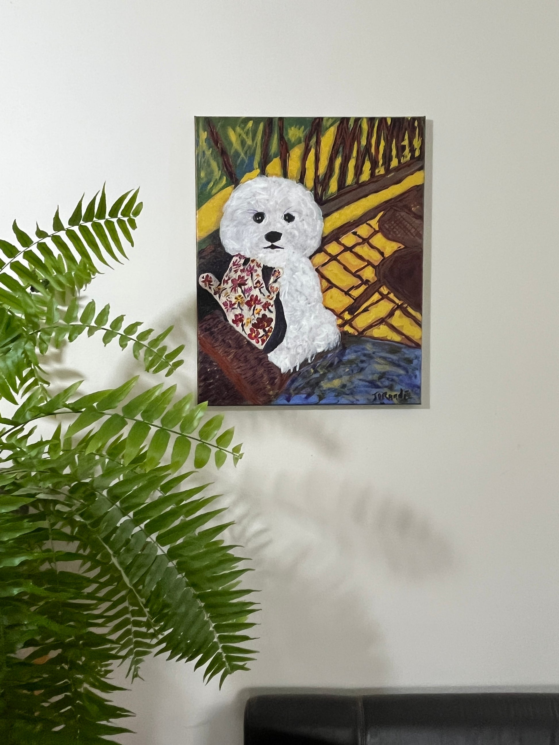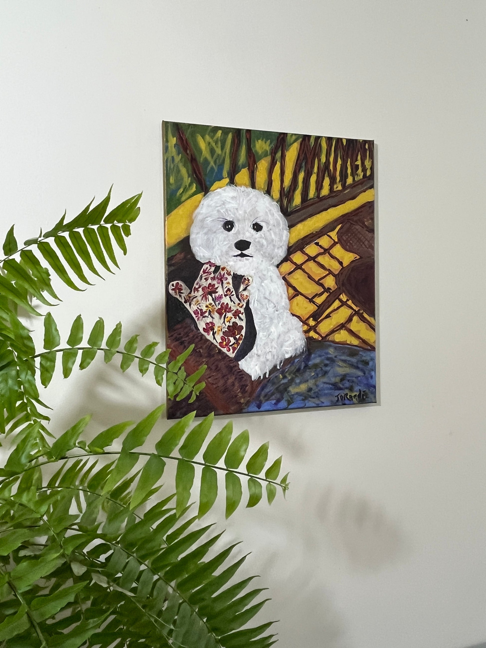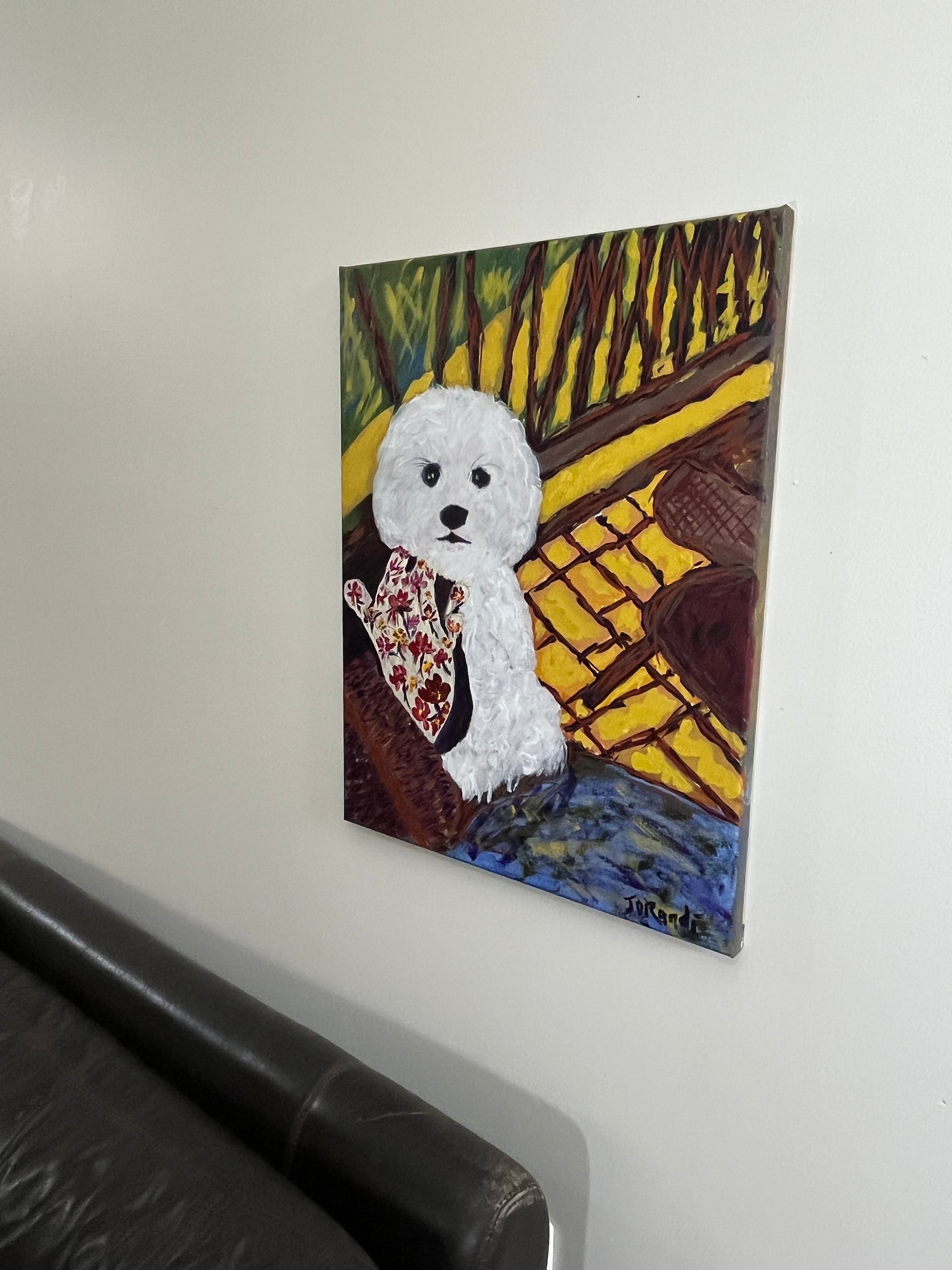 This painting captures a moment of quiet intimacy on a front porch, where the railing and tiles provide a rich, contrasting design. The pup who modelled for the piece is rendered with a unique stylistic hand that gives the canvas the quality of a quilt or a piece of craft, with flowers woven into the pattern. These associations bring a familiar and lovely innocence to the work, speaking to the universal themes of friendship, kinship, and family. While it has elements of abstract realism, the painting's heart is deeply impressionistic, focused on capturing a feeling rather than a literal likeness. It is a deeply comforting and heartfelt piece for a collector who appreciates art that celebrates the simple, profound joy of home and companionship.